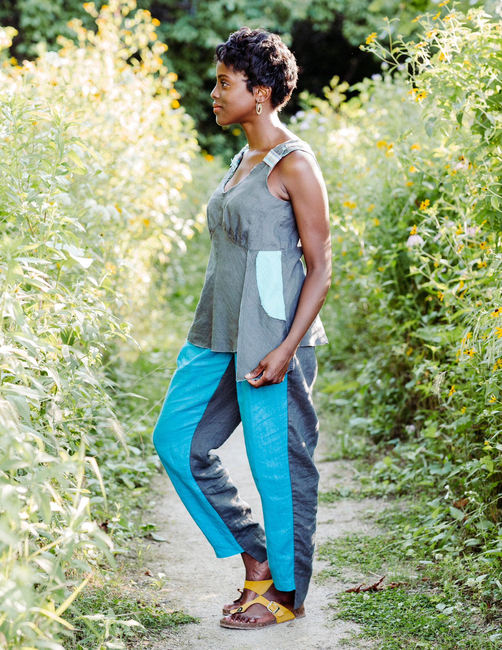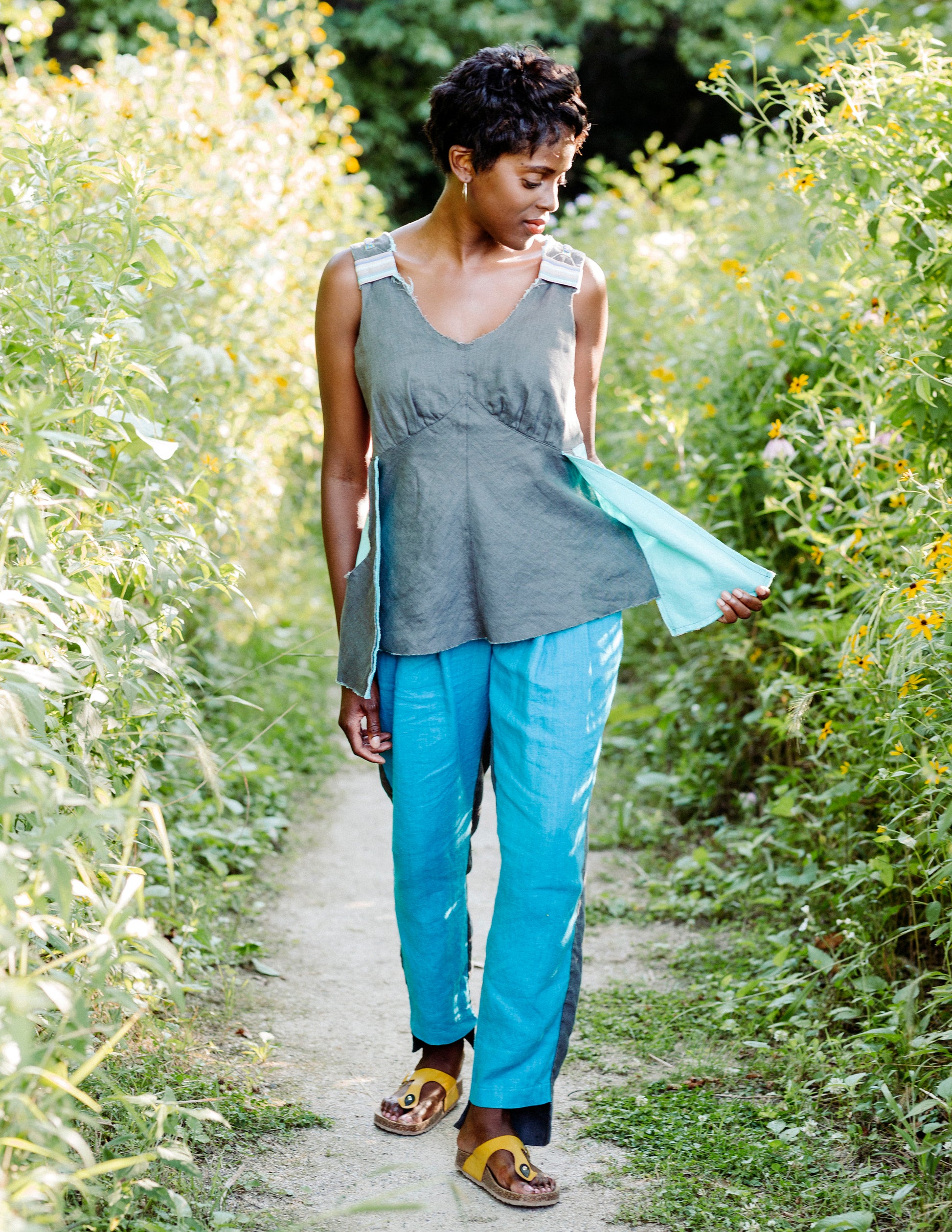 Deep V-neck sleeveless top with contrasting facing.